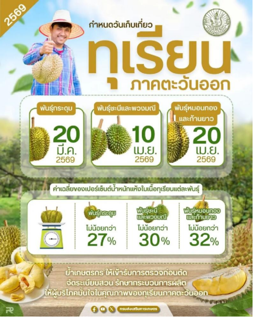 备受国内消费者期待的泰国榴莲即将迎来2026年新一季的采收盛宴。据泰国农业与合作社部下属农业推广厅发布:甲仑榴莲自 3 月 20 日起率先采收,青尼、托曼尼于 4 月 10 日上市,市场主流的金枕榴莲将于 4 月 20 日正式采收。这一系列严格的时间节点,正是泰国官方为确保果实充分成熟、杜绝生果流入市场而设的硬性门槛。这与高端榴莲品牌「华佑1号」一直以来坚守的“阳光标准”体系,不谋而合。